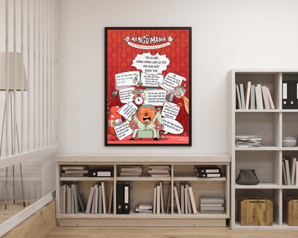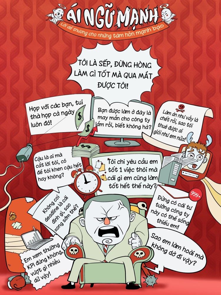 Hình ảnh phải dựng lên một ngữ cảnh chốn văn phòng rõ ràng để nội dung dễ hiểu. Hình ảnh ông sếp đóng vai trò chủ đạo và là “nguồn phát” của ái ngữ mạnh. Ông sếp ban đầu quá “điên”, sau đó thì quá “thủ đoạn”, cuối cùng mới ra được lão sếp đang có-vẻ-quạu – phù hợp với ý tưởng của dự án. Binh bố cục cho một lượng chữ rất nhiều trên poster, cân chỉnh khoảng cách giữa các khối chữ và màu sắc cũng làm 2 anh em Monstio điên cả đầu.